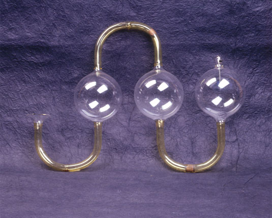 | Descrição: | Composto por um tubo com forma sinuosa, em vidro de urânio, com dois globos. |