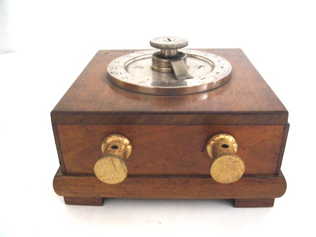 | Descrição: | Composto por uma caixa em madeira com dois ligadores na parte da frente e na parte superior encontra-se um círculo graduado onde desliza uma manivela, acionando o sistema interno, garantindo a variação da resistência no circuito indutor onde o reóstato de campo pode ser incorporado. |