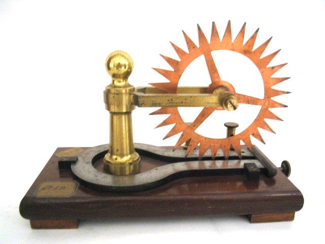 | Descrição: | Composto por uma roda com pontas que, no movimento de rotação que ela pode ter em torno de um eixo horizontal, mergulham sucessivamente numa cápsula com mercúrio que se acha entre os ramos de um magnete em forma de ferradura. Um contacto metálico comunica por meio da coluna com o eixo da roda, e outro comunica com a cápsula de mercúrio, fixando nestes contactos os reóforos da pilha, vê-se a roda a tomar movimento de rotação. Todos estes componentes estão assentes numa base em madeira. |