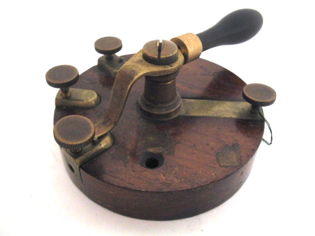 | Descrição: | Composto por uma base circular em madeira, ao centro da qual se levanta um pequena coluna de metal. Esta coluna serve de eixo de movimento a uma lâmina de latão curva em forma de “R” que se move por meio de um cabo, tocando três diferentes pontos, permitindo a comutação dos elementos incluídos no circuito. O cabo é sempre formado por uma substância isoladora, neste caso ebonite. |
