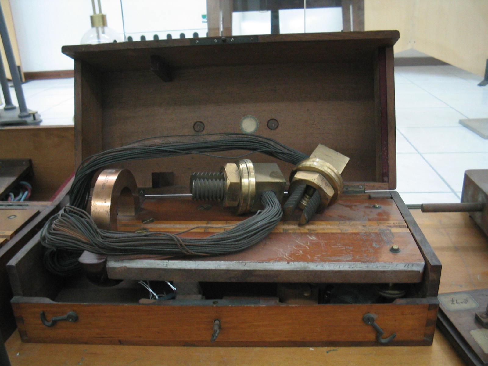 | Descrição: | Este galvanómetro de intensidade pouco difere do galvanómetro de potencial do mesmo autor. A única diferença é a composição da sua bobina, que é formada, neste caso por uma barra de cobre. Foi muito usado em laboratórios industriais. Ele compõe-se de duas partes essenciais: 1ª a bobina que está fixa solidamente a uma das extremidades da prancheta de madeira que suporta todos os componentes, sobre a qual existe uma ranhura longitudinal normalmente centrada face à bobina; 2ª um magnetómetro (aparelho que serve para se conhecer a força atrativa de um íman), a ponta do ponteiro move-se ao longo de uma escala de tangentes. O fundo da caixa é formado por um vidro espelhado para fazer uma leitura, o observador coloca-se de maneira a que a ponta do ponteiro reflita a sua imagem no vidro espelhado; evita-se deste modo erros de paralaxe. A caixa do magnetómetro pode deslizar ao longo da ranhura da prancheta de madeira. Para aumentar a força diretriz que agita a agulha magnetizada, o magnetómetro é munido de um íman semicircular que pode fazer variar ligeiramente a posição no meio de um parafuso móvel, de maneira a ajustar o ponteiro no zero da escala depois de colocar o aparelho a elaborar a experiência. Pode-se fazer variar a sensibilidade deste galvanómetro dentro dos limites muito extensos deslocando o magnetómetro ao longo da prancheta; em suprimento do íman diretor, a sensibilidade surge agora com mais intensidade. A ranhura do meio, comporta um certo número de divisões correspondentes às diversas posições do magnetómetro. Um nome inscrito à beira do traço da divisão indica a derivação correspondente a 1 volt, se a intensidade do campo é de 1 unidade C.G.S. (centímetro, grama e segundo) o valor da componente horizontal do campo magnético produz no centro da bobina por íman diretor e inscrito sobre o instrumento. Na extremidade onde está colocada a bobina saem dois ligadores formados por vários fios de cobre e com uma peça em latão no final. |