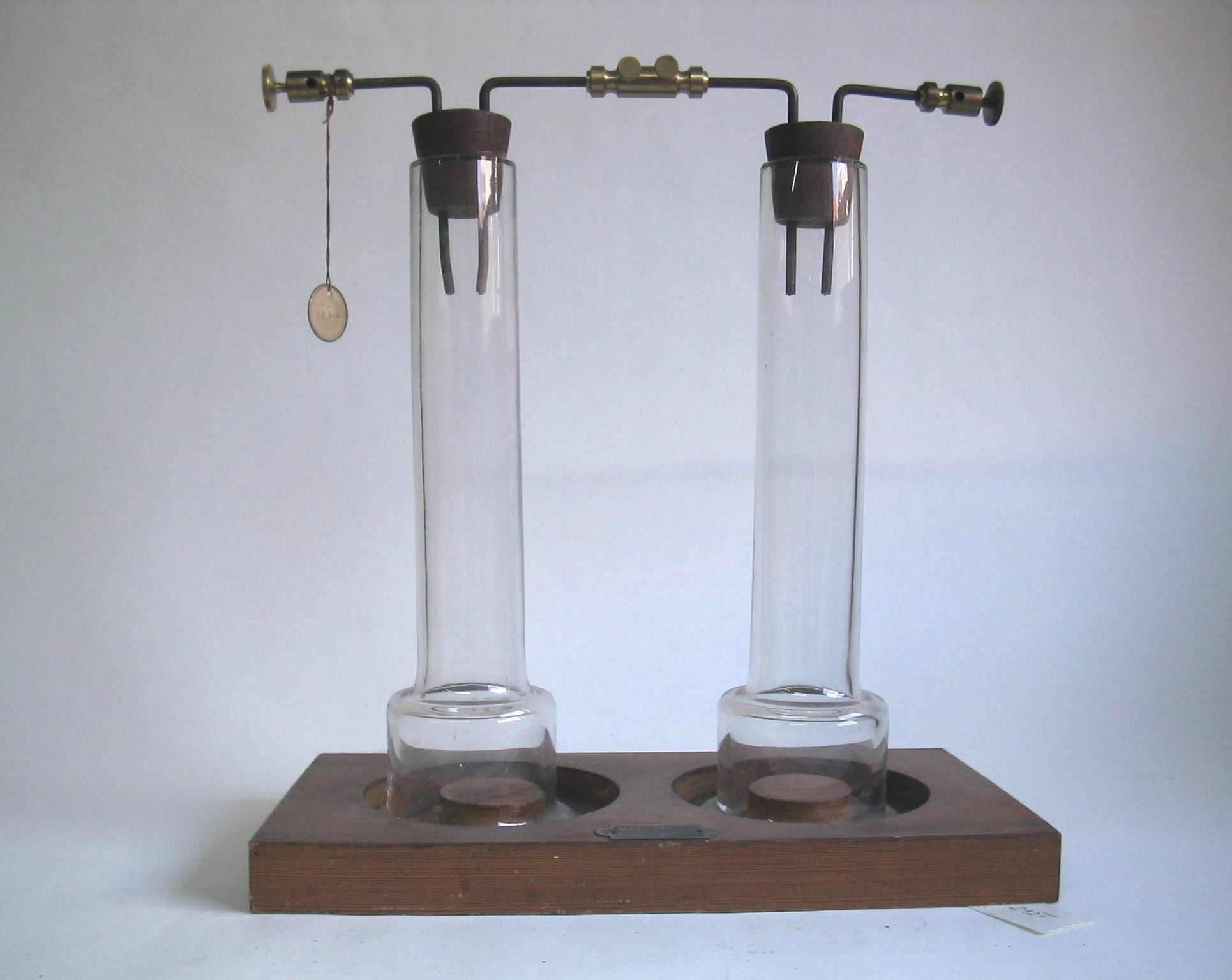 | Descrição: | Composto por dois tubos de vidro apoiados numa base de madeira. Dentro de cada tubo de vidro está uma rolha de cortiça com revestimento a lacre, onde estão introduzidos dois arames de cobre. Nas extremidades de cada arame existem ligadores em latão. |