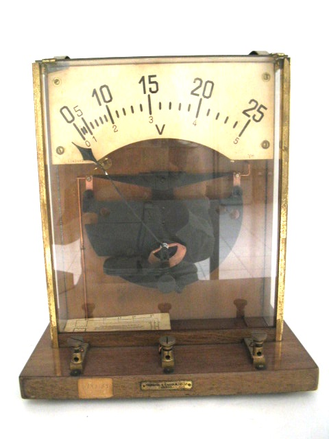 | Descrição: | Todo o aparelho está assente numa base de madeira. Dentro de uma caixa em vidro está o dispositivo principal (escala, ponteiro e bobina) e fora encontram-se três ligadores em latão. Quando colocado em derivação num circuito liga-se um dos bornes da fonte ao ligador esquerdo e o outro borne ao ligador direito, a leitura é feita através da passagem de uma pequena corrente na bobina. Se a tensão for superior aquela que o voltímetro pode medir, insere-se uma resistência, que ficará em série ao ligador central, permitindo fazer a leitura de uma tensão superior. O número de volts agora indicado pelo ponteiro terá que ser multiplicado pelo fator introduzido pela resistência adicional, para se saber qual a tensão elétrica que mede naquele ponto do circuito. |