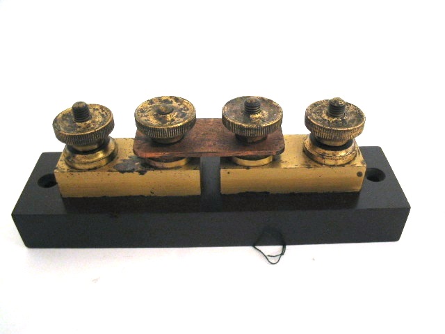| Descrição: | Objeto simples e de pequenas dimensões com uma base retangular em ebonite com duas placas em latão encaixadas na sua superfície contendo cada um dois ligadores, também eles em latão. |
