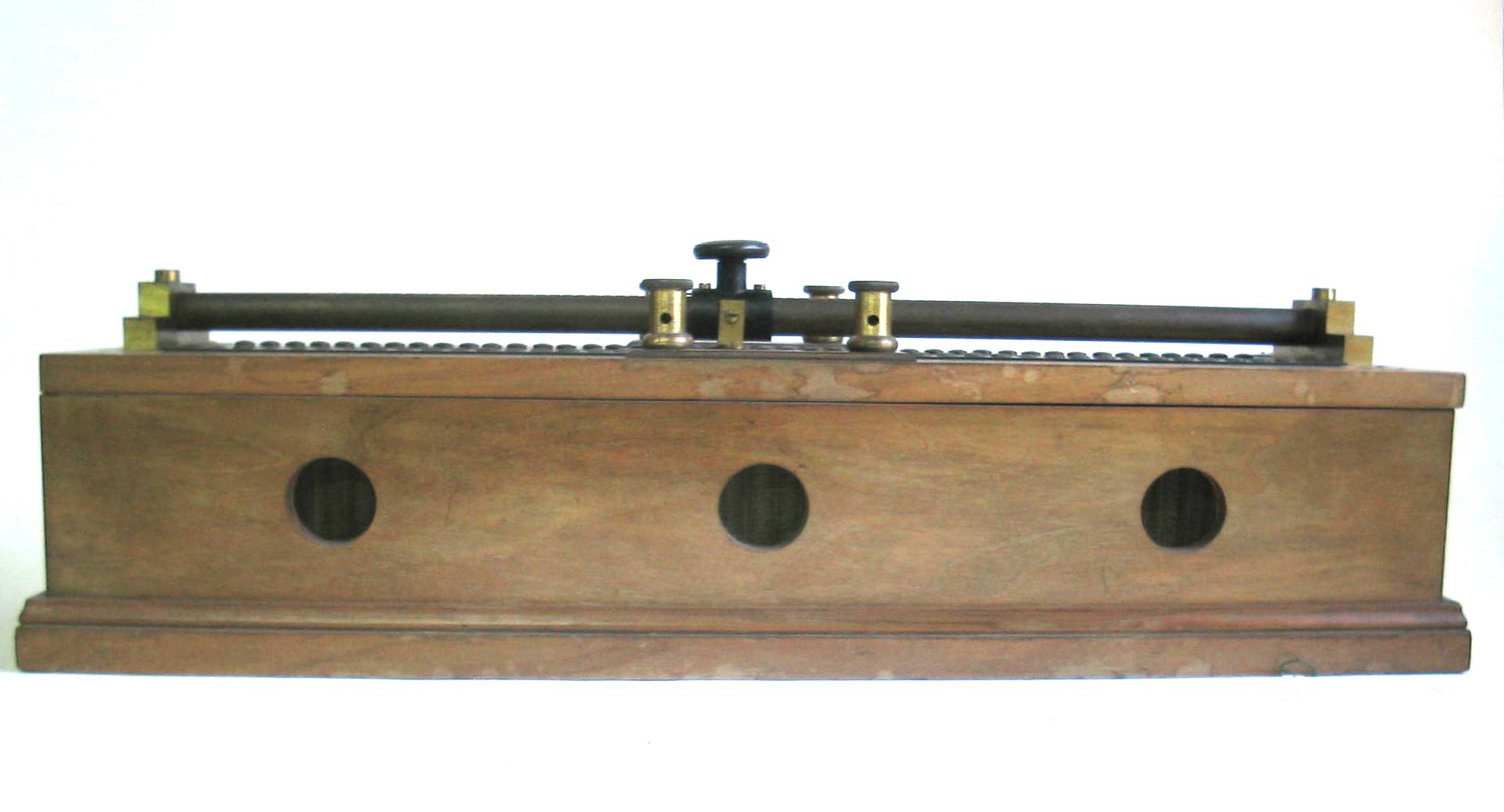 | Descrição: | Composto por uma caixa em madeira, onde no seu interior estão colocadas uma série de resistências. Na parte superior do aparelho encontra-se uma barra em metal onde desliza um pequeno cursor, vários pontos de contacto, uma escala que vai de 10 a 80 e quatro bornes em latão, posicionados dois de cada lado da barra. Num dos lados coloca-se a tensão conhecida, que neste caso é de 110 volts, e no outro pode-se colocar dois aparelhos utilizando tensões com potencial variável. O cursor ao deslizar ao longo da barra metálica cria a tensão correspondente às necessidades dos aparelhos ligados aos bornes de latão. Sendo assim a resistência é graduada podendo através do movimento do cursor crescer ou decrescer permitindo a utilização de tensões variadas. |