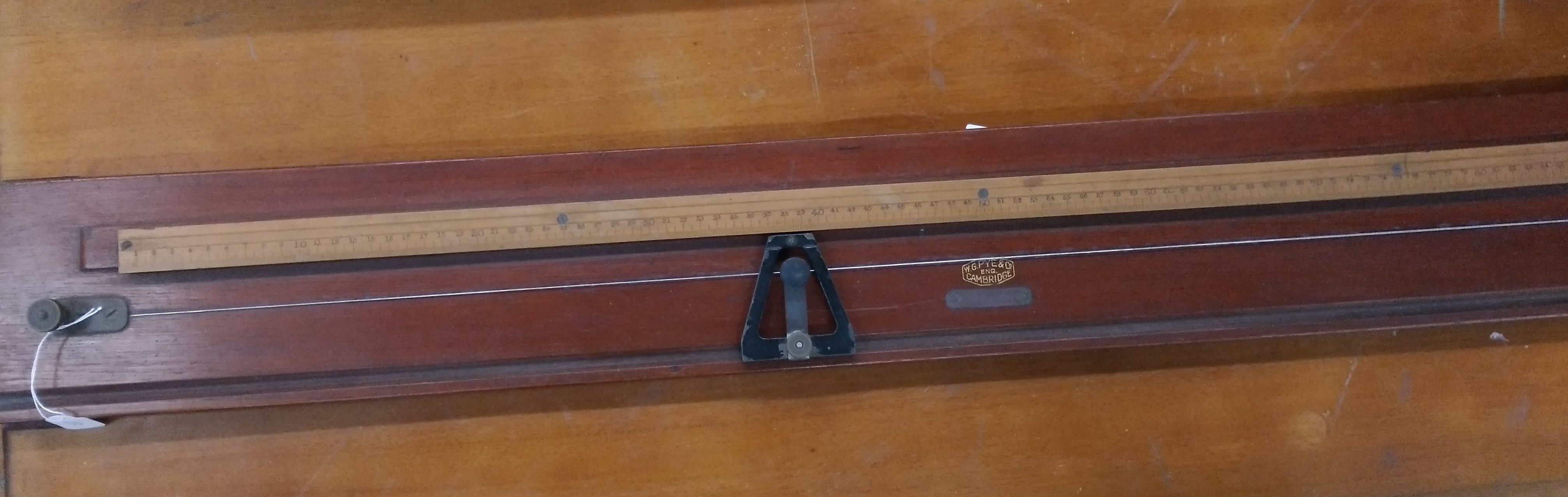 | Descrição: | Este aparelho só funciona quando associado a outros, incorporando desta forma o método da ponte de Wheatstone. Os outros elementos são um galvanómetro, uma resistência padrão, uma resistência a medir e uma fonte de alimentação. Este objeto é de construção muito simples. Resume-se a uma prancheta de madeira, com aproximadamente 115 centímetros, com uma régua graduada de 0 a 100. Possui igualmente um fio de platina que percorre todo o comprimento da referida prancheta, estando munido nas extremidades de um ligador em latão. Numa ranhura, colocada no lado oposto ao da régua graduada, desliza um cursor em latão de formato triangular, pintado de cor preta, com um ligador e um pequeno botão coma cabeça em ebonite, para se poder achar, ou melhor medir a resistência que se deseja. |
