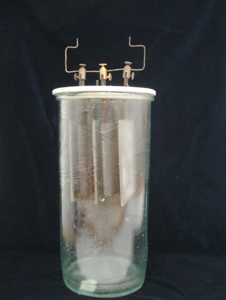 | Descrição: | Composta por um vaso de vidro com três placas de zinco e duas de cobre no seu interior, mergulhados numa solução de potássio cáustico de 30 ou 40 por cento, como líquido excitador e óxido de cobre que colocado em contacto com uma superfície metálica funciona como despolarizante. A tampa é em cerâmica possuindo três ligadores em latão no topo da mesma, que correspondem ao polo negativo da pilha e um quarto ligador, mais pequeno que corresponde ao polo positivo. A sua intensidade vai desde 6,4 amperes no início, alterando-se para 6 amperes depois de vinte e uma horas de utilização ou para 5 amperes depois de setenta e duas horas de utilização. Ela pode constituir um gerador prático e simples de energia elétrica. |