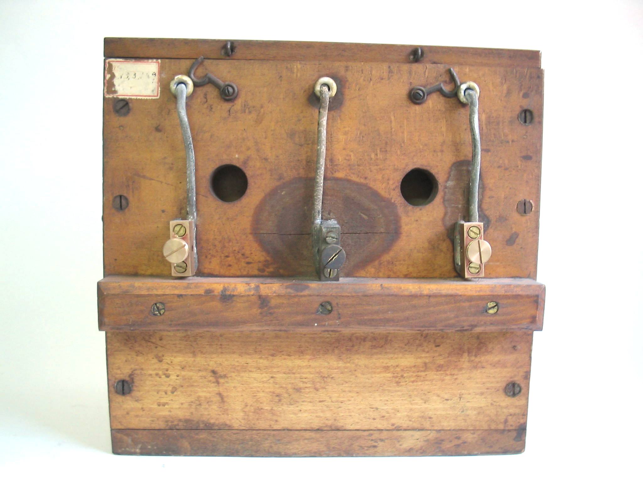 | Descrição: | Composto por uma caixa de madeira onde no seu interior estão dois compartimentos distintos, cada um correspondendo a um acumulador. São constituídos por seis placas de chumbo com alvéolos cheios de mínio Pb3O4. A corrente de carga decompõe a água, oxida o mínio no ânodo, transformando-o em bióxido de PbO2, e no cátodo reduz o mínio a chumbo metálico. Exteriormente temos três pontos de ligação, que nos possibilitam duas combinações diferentes: 1ª ligar em série, utilizando os pontos colocados nos extremos, utilizando toda a carga disponível; 2ª utilizando o ligador do centro conjuntamente com um dos lados, utilizando-se só a carga de um dos acumuladores. Um acumulador é como um reservatório que contém uma quantidade determinada de eletricidade. Praticamente representa o papel de um condensador de grande capacidade, embora não há acumulação alguma de eletricidade durante a carga, mas sim reações químicas produzidas pela passagem da corrente de carga e outras reações químicas inversas das precedentes que se produzem durante a descarga. Este monta-se como as pilhas, em série, em bateria ou em associação mista. |