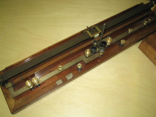 | Descrição: | Composta por um fio de platina esticado ao longo de uma régua dividida em milímetros, com um ligador em cada ponta, onde está apoiado um cursor com nónio, munido de um botão permitindo por em contacto a um determinado momento o cursor com o fio de platina. As duas extremidades do fio estão em comunicação com as bandas em latão separadas umas das outras e terminando em cada ponta por um godé em latão cheio de mercúrio. Ao centro estão colocados quadro godés de latão e dois em ebonite. Toda a estrutura assenta numa base de madeira. |