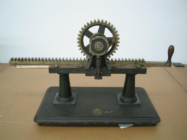 | Finalidade: | Utilizado para demostrar o estudo do movimento independentemente da forma (cinemática), permitindo a sua interpretação mais objetiva, através da observação direta dos mecanismos. Neste caso, representa a transformação do movimento de rotação em movimento retilíneo alternativo mediante cremalheira e roda dentada. |
