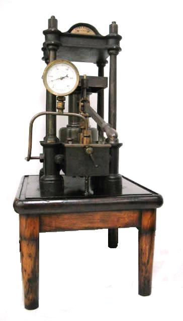 | Descrição: | Composta por um cilindro compressor que tem na parte superior um prato destinado à colocação dos objetos que se pretende comprimir, o corpo de bomba que está assente no estrado onde se fixam solidamente quatro colunas que seguram na parte superior uma chapa bastante espessa contra a qual se comprimem os objetos colocados no prato superior. A bomba de injeção é uma bomba premente ou aspirante-premente que mergulha num reservatório de água e comunica com o corpo da bomba por um tubo estreito que pode estar em comunicação com um manómetro para se conhecer o valor da compressão. Para esvaziar o corpo de bomba há uma torneira no tubo de comunicação. O funcionamento é simples de compreender - levantando o êmbolo a válvula, em virtude da implosão do líquido exterior, levanta-se e deixa entrar uma certa quantidade, depois fazendo descer este êmbolo, a válvula fecha-se, e a água recalcada faz subir a outra válvula e passa pelo tubo para o cilindro, de onde não pode voltar, porque a válvula impede o movimento inverso. |