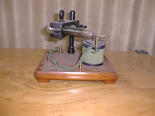 | Descrição: | Composto por uma base em madeira, onde está colocado um transformador, um suporte onde é colocado um interruptor, que é um interruptor de Neef mas que está fechado dentro de um tubo de vidro em vácuo de ar. Este dispositivo suprime em grande parte a faísca de rutura dos interruptores ordinários. |