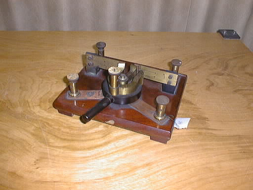 | Descrição: | Composto por dois bornes, apresenta um disco de ebonite, munida de uma manete que se move à volta dum eixo vertical. Este disco tem na parte superior duas peças de latão em forma de ferradura e outra uma barra de ebonite. Existem peças metálicas ligadas aos bornes, que fazem a comutação da corrente. |