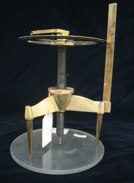 | Descrição: | Composto essencialmente por um parafuso micrométrico, cujo passo é de meio milímetro, que se pode mover numa porca fixa sustentada num tripé. |