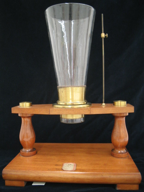 | Descrição: | Composto por três vasos de secções iguais na parte inferior, que podem aparafusar-se verticalmente num anel sustentado por um suporte. O fundo de cada vaso pode ser tapado por uma placa ou obturador que se prende ao gancho de um dos pratos de uma balança hidrostática e que se adapta exatamente ao fundo do vaso. |