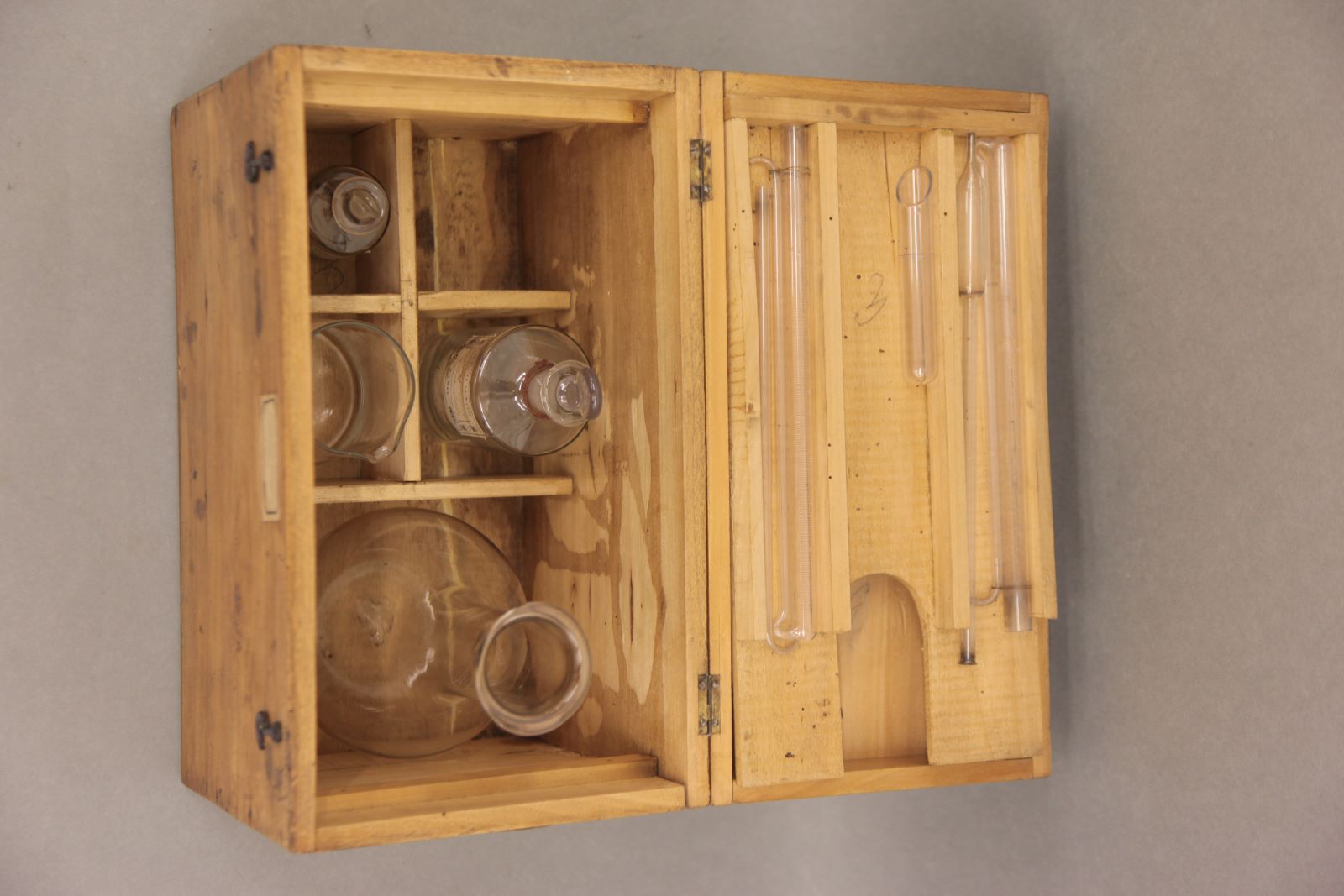 | Descrição: | Composto por uma caixa em madeira com oito utensílios em vidro (frasco, balão proveta) utilizados na medição do cloro. |