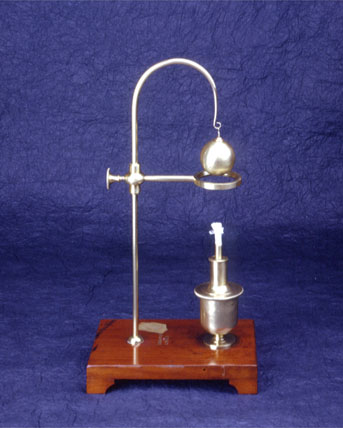 | Descrição: | Composto por uma base em madeira, onde assenta um suporte com uma esfera de latão suspensa e um anel, com quase o mesmo diâmetro da esfera e uma pequena lamparina. Esta última tem como função fornecer calor à esfera. |