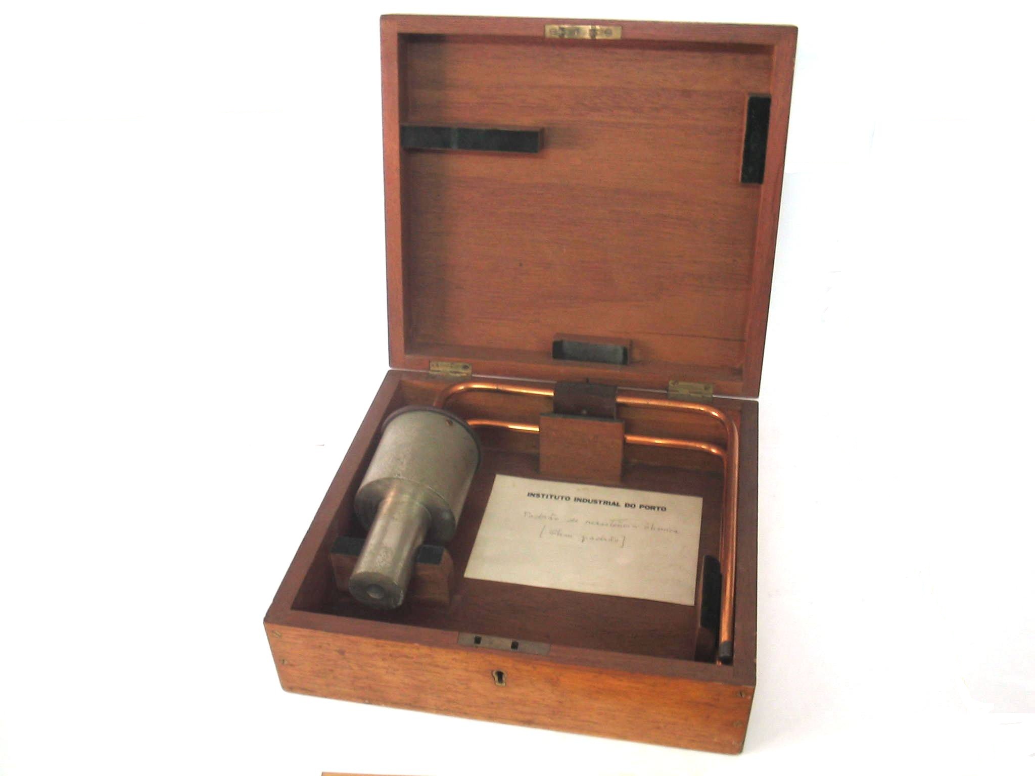 | Descrição: | Composto por duas varetas de cobre, com uma pequena peça em ebonite ao centro e a resistência propriamente dita. As duas varetas de cobre eram mergulhadas em duas tinas de mercúrio, de modo a assegurar uma boa conexão elétrica. |