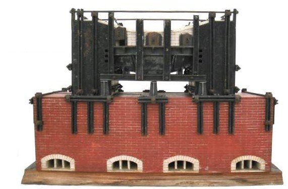 | Finalidade: | Utilizado como modelo didático nas aulas de metalurgia, que permitia explicar a constituição e o funcionamento de um forno Martin-Siemens e a produção de aço homogéneo. Trata-se de um forno horizontal longo, com diversas aberturas laterais por onde se processa a carga, sendo o escoamento do aço líquido feito por intermédio de canalículos que vêm do fundo do “leito” do forno e saem em sentido oposto às aberturas de carga. O calor no interior do forno é conseguido mediante a queima de um combustível gasoso ou a óleo que é insuflado numa das extremidades do forno. Os gases por sua vez são exalados pela extremidade oposta, não sem antes passarem por um recuperador, que nada mais é do que um empilhamento de tijolos na parte inferior do forno. Isto é necessário para que tais gases, de elevada temperatura, possam ceder calor antes de se dirigirem às chaminés. |