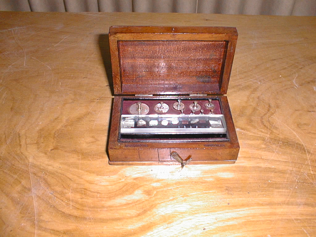 | Descrição: | Composta por uma serie de pesos de precisão em caixa de madeira polida, com pesos em latão e subdivisão a partir de 0,5g em alumínio, falta-lhe a pinça. |