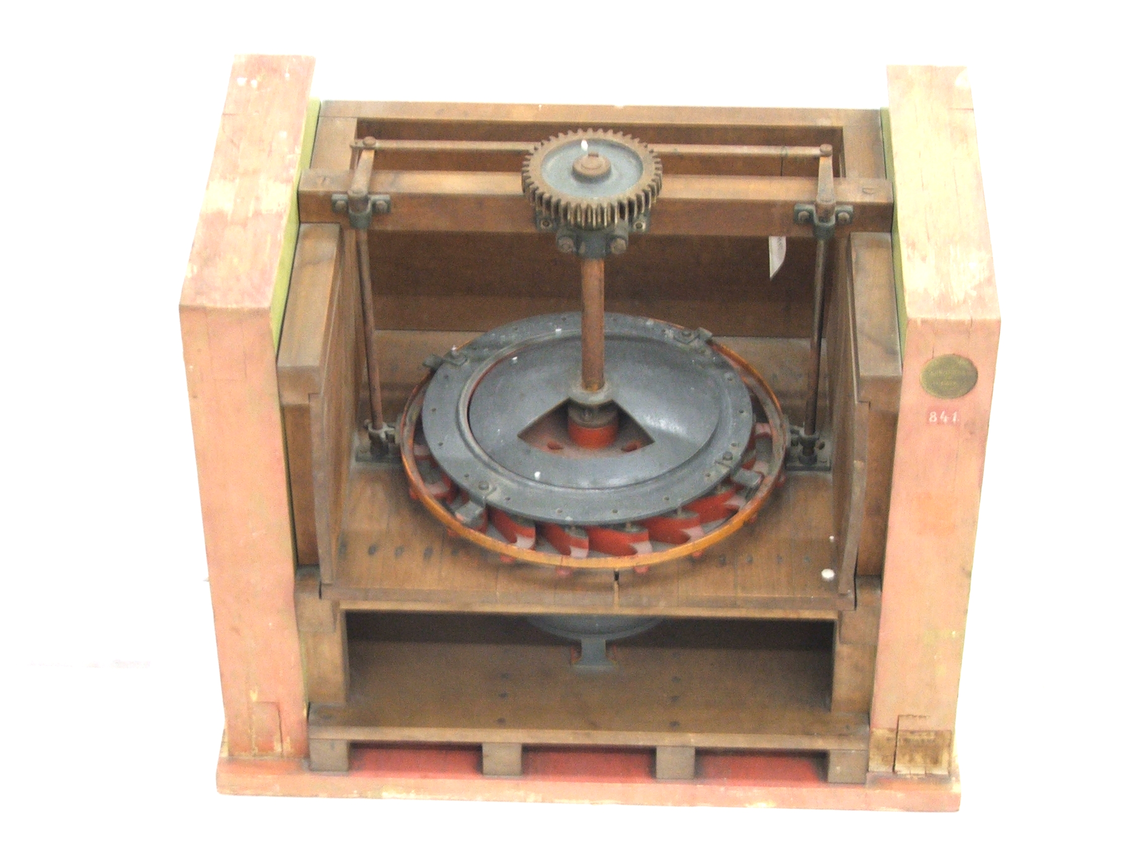 | Descrição: | Este modelo tem como estrutura base de suporte duas paredes laterais consistentes em madeira unidas por uma outra mais estreita na parte de trás. O seu interior está dividido em três áreas. Na parte superior da estrutura existe uma roda dentada com 8,5 cm de diâmetro ligada ao eixo da roda da turbina que se encontra localizada na divisão do meio. A roda está protegida por uma estrutura metálica redonda com a parte superior em forma de cúpula. As pás da roda, disposta horizontalmente, estão fixas por solda ao aro da estrutura metálica que a protege. Nos pontos opostos da roda encontram-se dois veios metálicos dispostos verticalmente, unindo-se um ao outro na parte superior por um fulcro através de uma roda de dois dentes que permitem mover a roda. |
