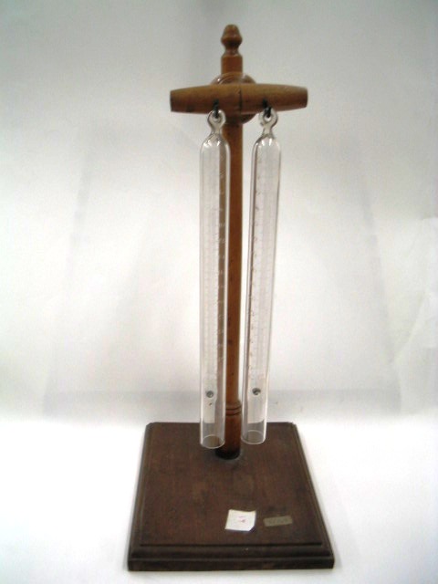 | Descrição: | Composto por dois tubos graduados suspenso num suporte em madeira, e um copo de vidro (copo em falta). |