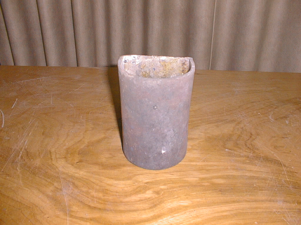 Vaso com abertura lateral construído em cerâmica refratária. A parte superior do vaso é arqueada. Possui uma fenda vertical, em cada um dos lados da mufla.