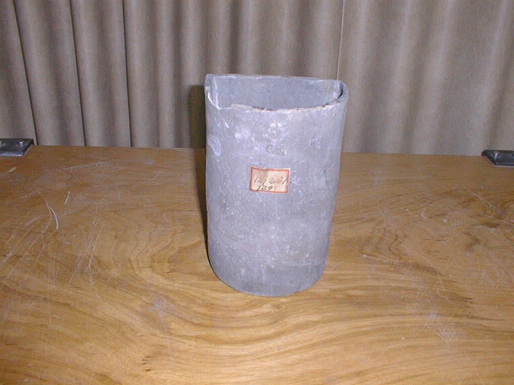 Vaso com abertura lateral construído em cerâmica refratária. A parte superior do vaso é arqueada. Possui uma fenda vertical, em cada um dos lados da mufla.