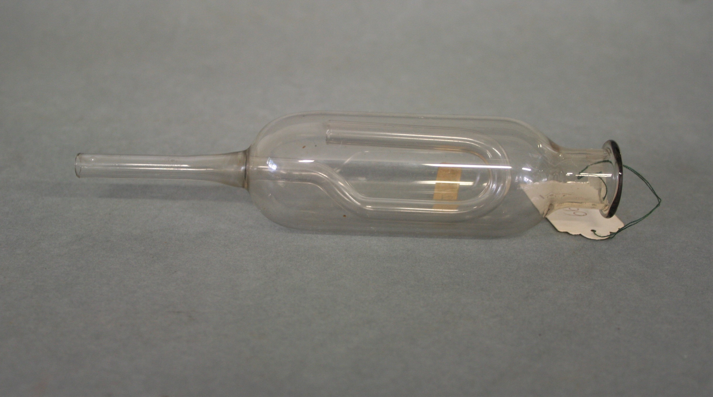 | Descrição: | Composto por um tubo de vidro com uma tubuladura superior e um tubo estreito e curvado no seu interior. |