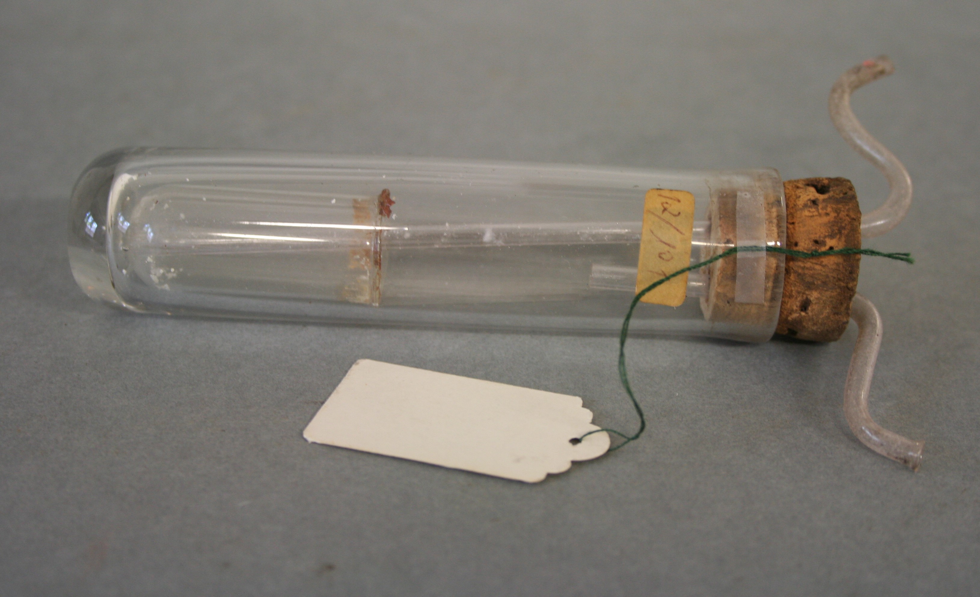 | Descrição: | Tubo de vidro que se carateriza pelo seu formato cilíndrico sendo tapado por uma rolha de cortiça. Esta rolha de cortiça é atravessada por dois tubos de pequena dimensão. |