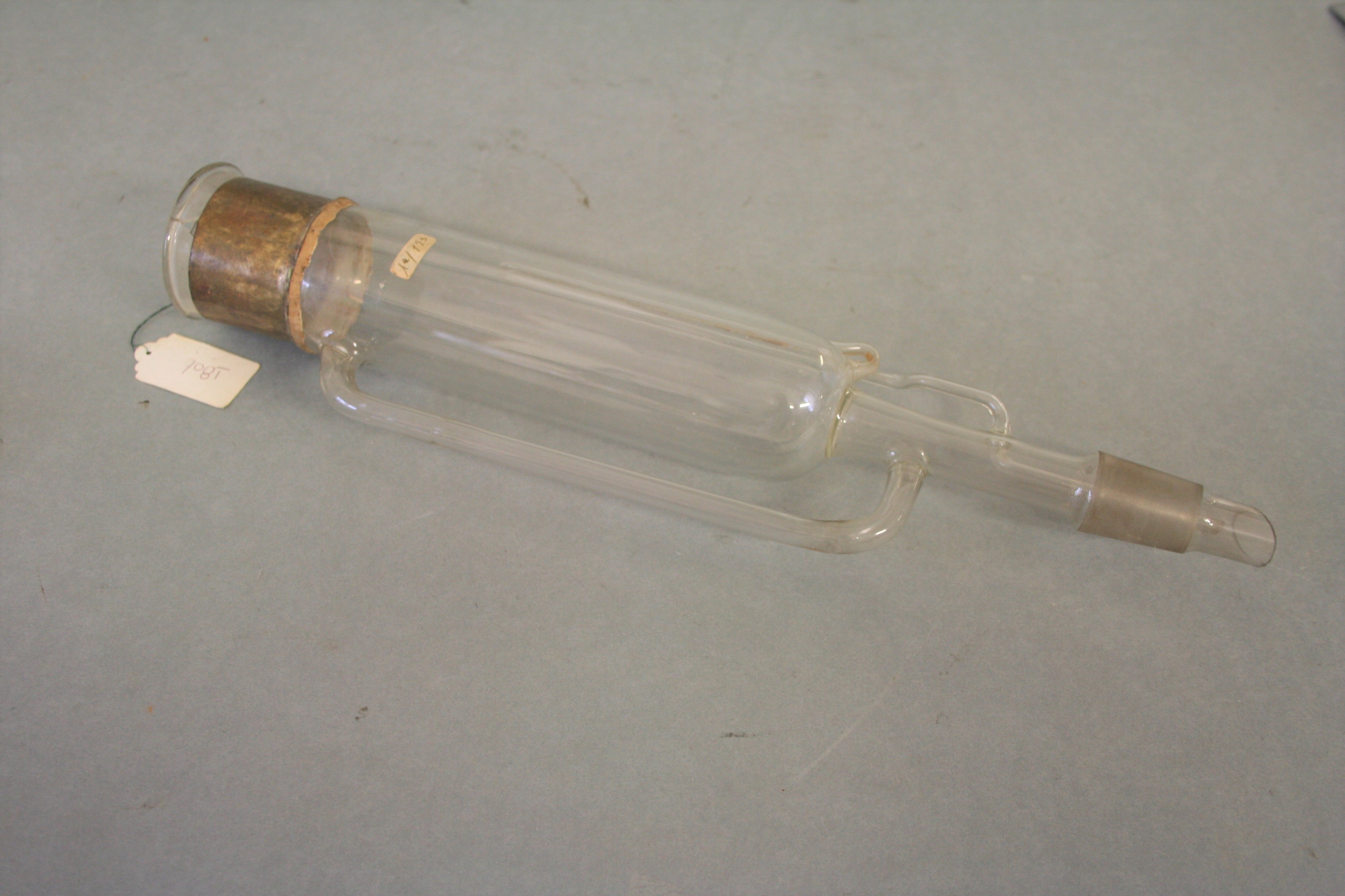 | Descrição: | Composto por um cilindro de vidro com um tubo mais estreito na base que entra num balão. Tem um estreito tubo lateral que está soldado e ligado logo abaixo do refrigerante. Possui ainda um sifão está adaptado à base do cilindro, sobe cerca de dois terços da altura, com a finalidade de trazer o líquido de volta para o tubo sob o cilindro e, assim, para dentro de um balão. |