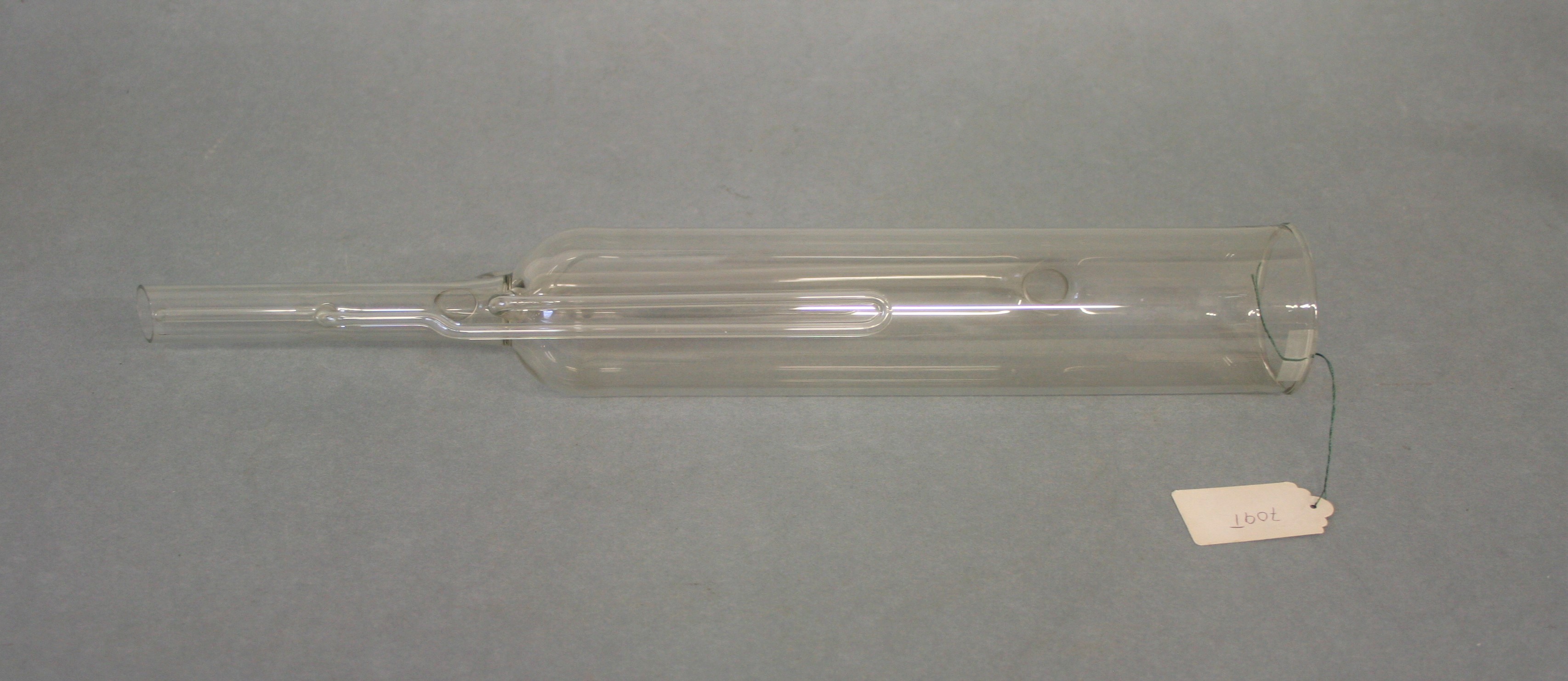 | Descrição: | Composto por um cilindro de vidro com um tubo mais estreito na base que entra num balão. Tem um estreito tubo lateral que está soldado e ligado logo abaixo do refrigerante. Possui ainda um sifão está adaptado à base do cilindro, sobe cerca de dois terços da altura, com a finalidade de trazer o líquido de volta para o tubo sob o cilindro e, assim, para dentro de um balão. |