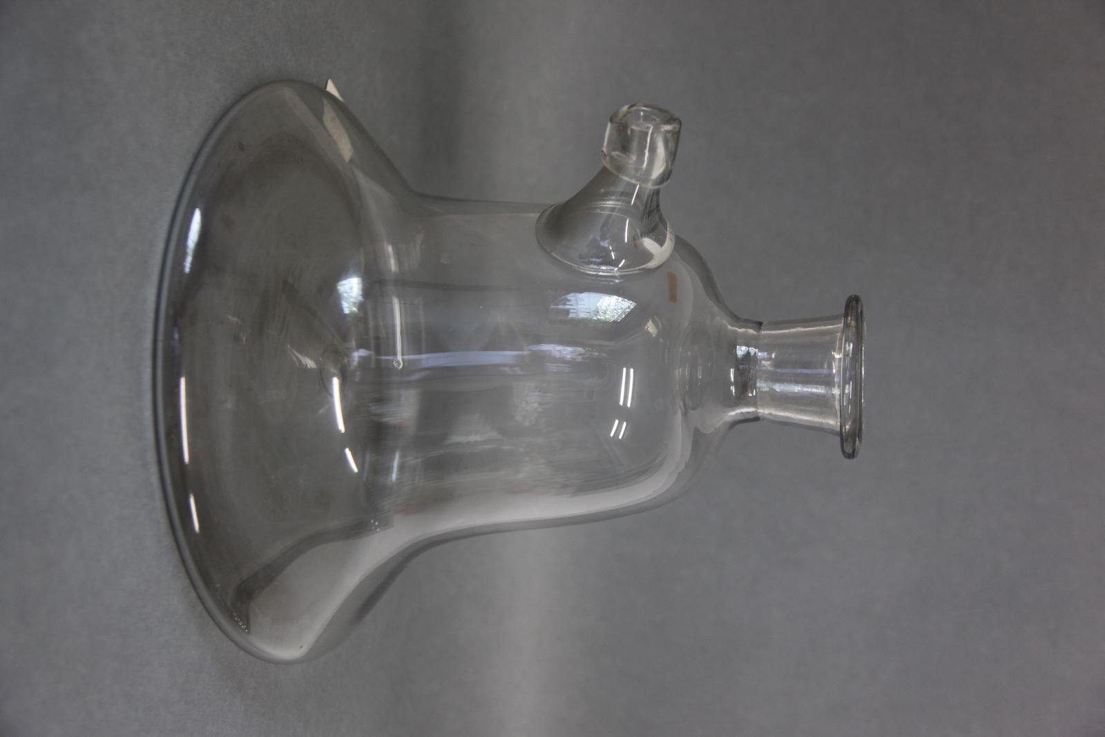 | Descrição: | Vaso, de vidro espesso, em forma de sino, composto por gargalo e tubuladura lateral. |