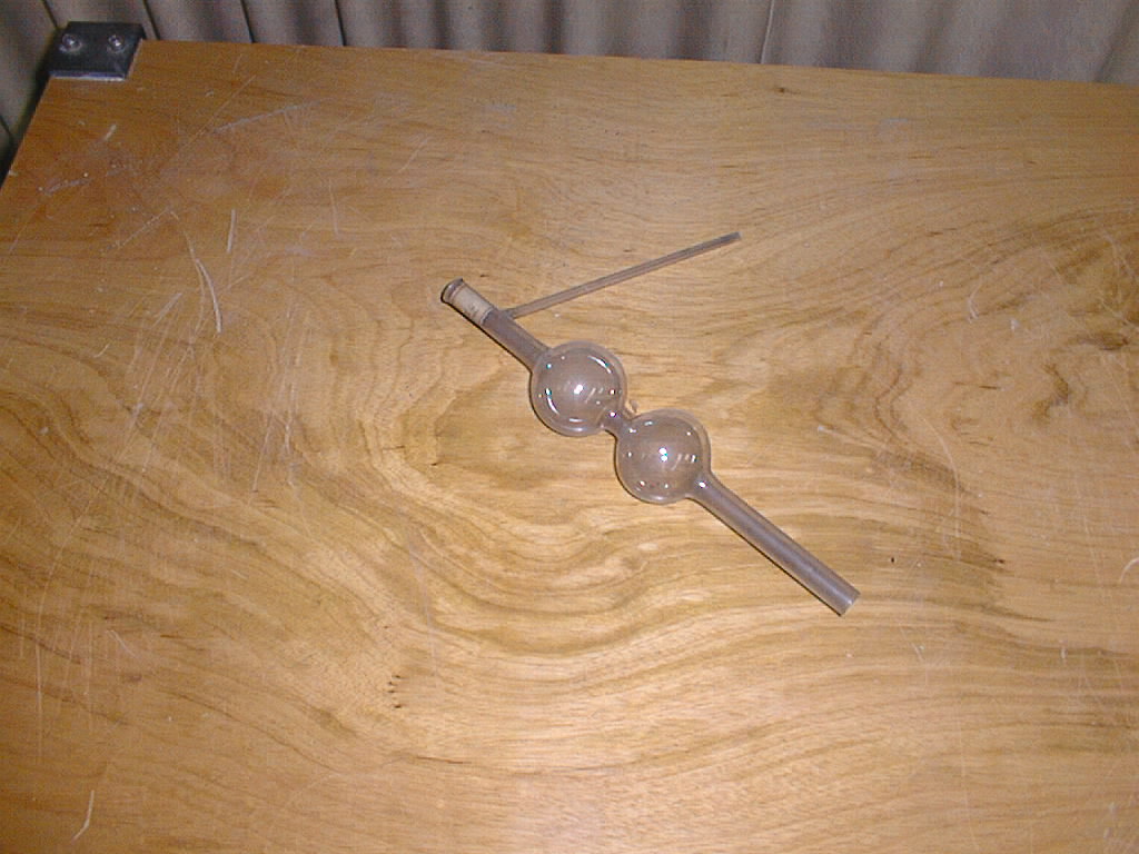 | Descrição: | Composto por um tubo estreito de vidro com duas bolas e uma tubuladura lateral. |