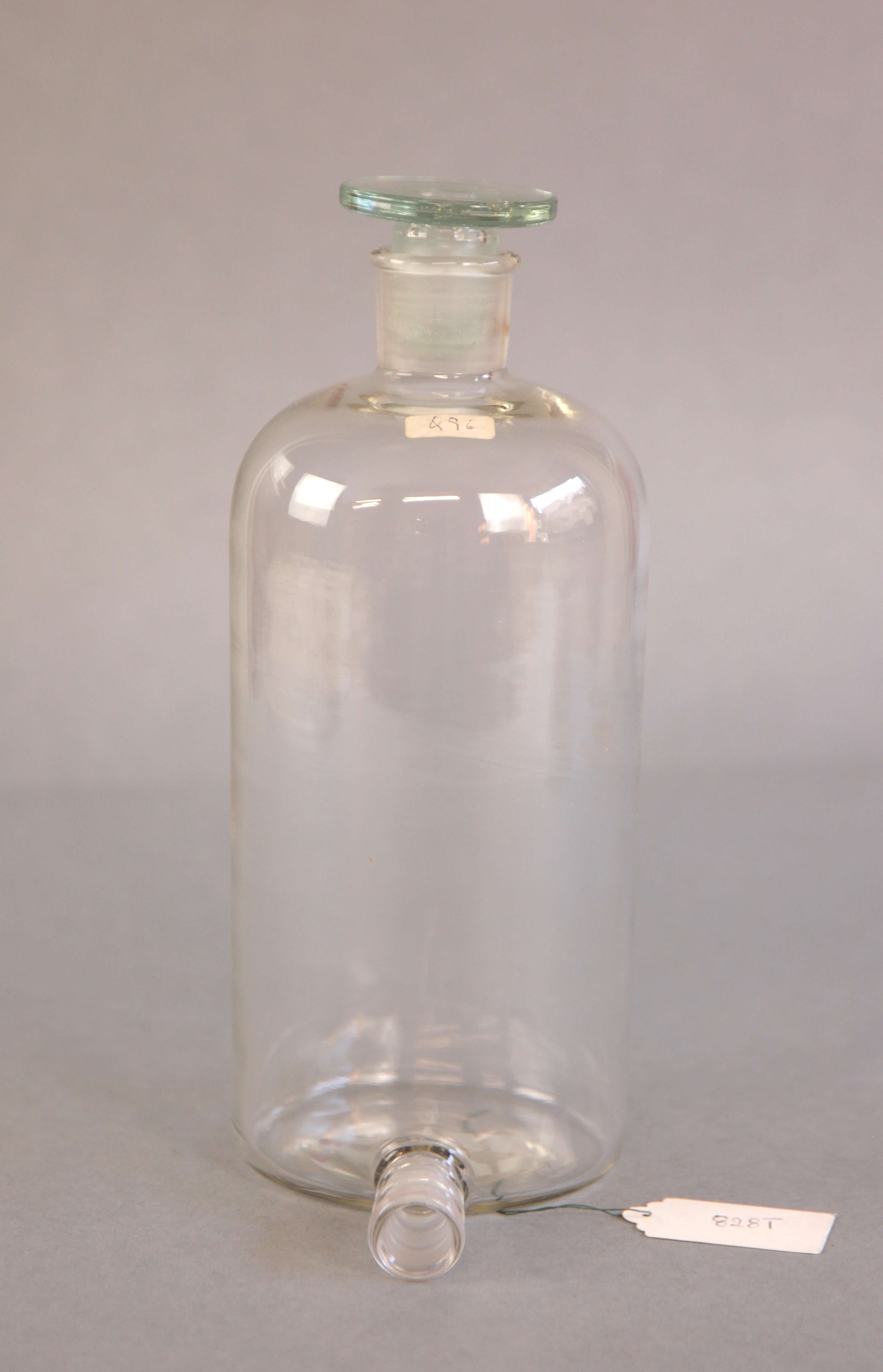 | Descrição: | Composto por um recipiente de vidro com tubuladura na parte inferior, gargalo e rolha esmerilada. |