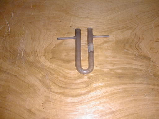 | Finalidade: | Algumas experiências de química orgânica envolviam reações que precisavam ser feitas na ausência de água. As pastilhas de cloreto de cálcio em tubos agem como dessecantes, ou agentes secantes, removendo a humidade do ar que passa por elas. Estas eram mantidas no lugar por tampões de lã de vidro. Conforme o ar passava pela lã de vidro e pelo cloreto de cálcio este era desumidificado de forma que quando chegasse à câmara de reação tivesse pouca ou quase nenhuma humidade. |