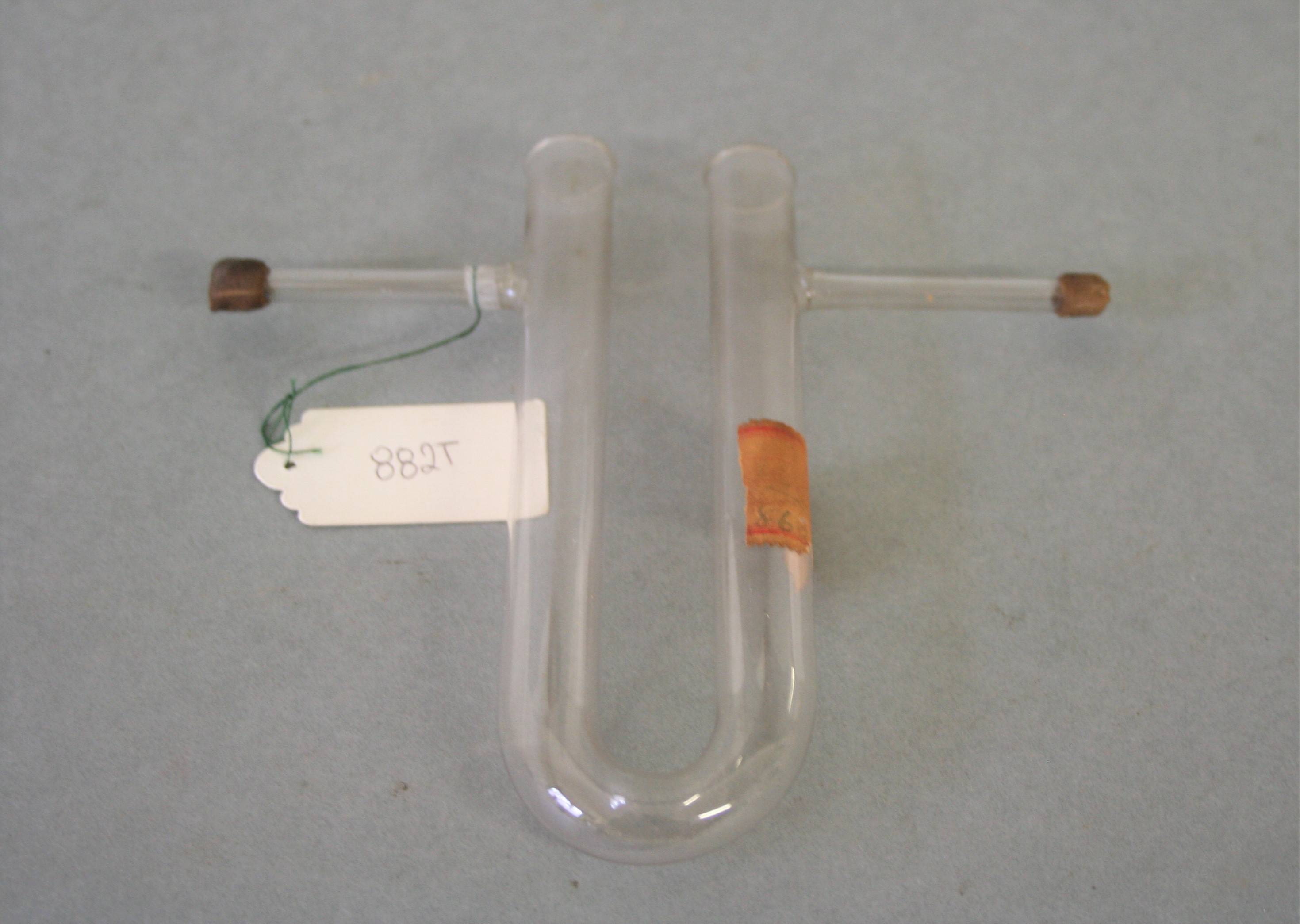 | Descrição: | Composto por um tubo de vidro em forma de U. Em cada braço estão colocado pequenos tubos. No seu interior eram colocadas pequenas pastilhas de cloreto de cálcio. |