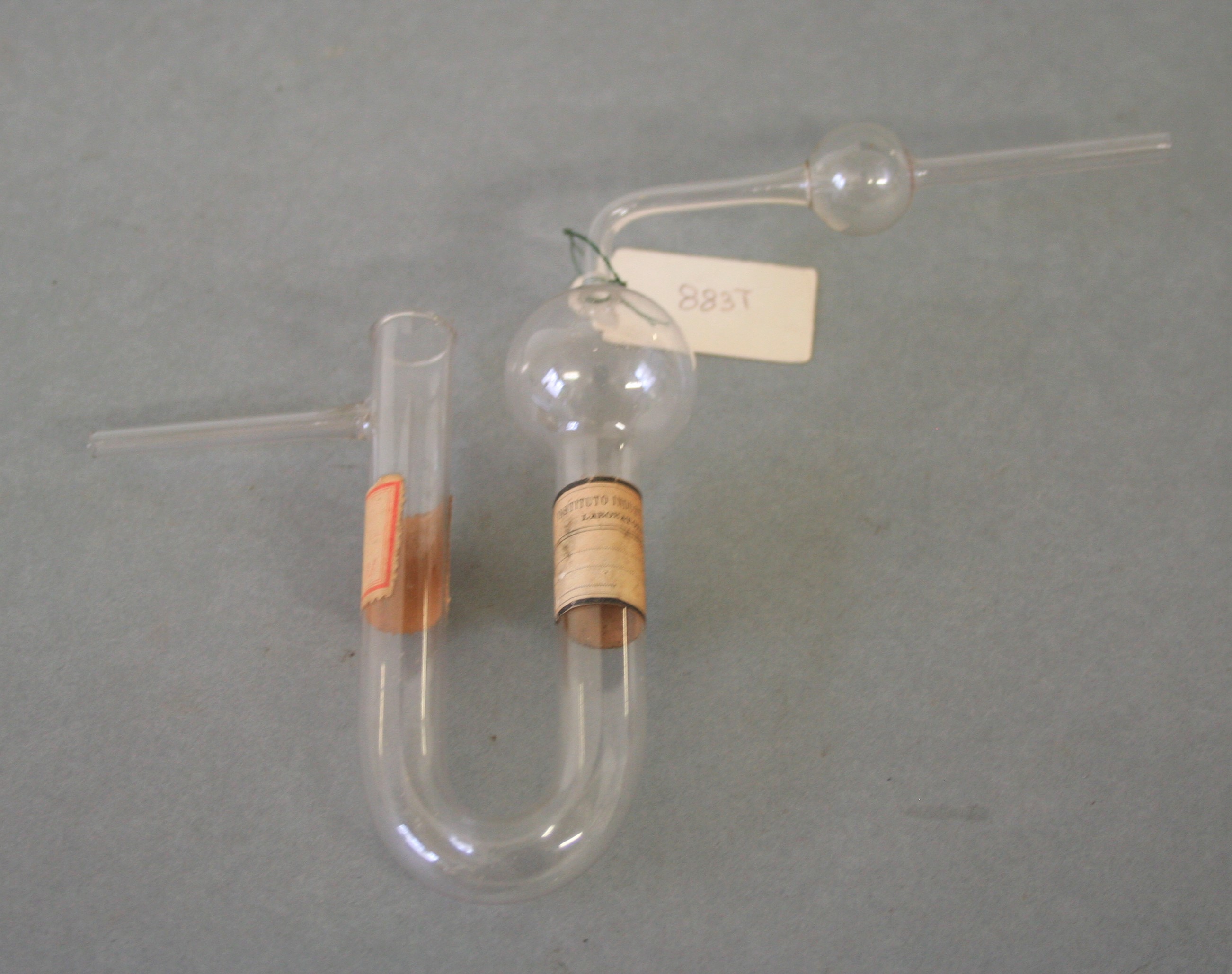 Composto por um tubo de vidro em forma de U com duas esferas e um tubo lateral.