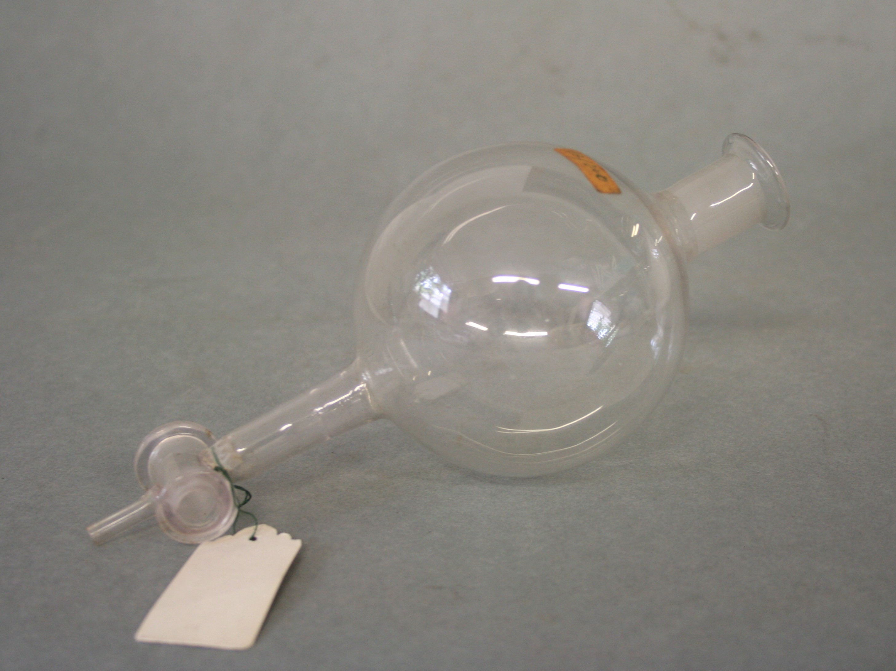 | Descrição: | Composto por um recipiente esférico de vidro com uma pequena tubuladura na parte superior e no lado oposto um tubo estreito com uma torneira no final. |
