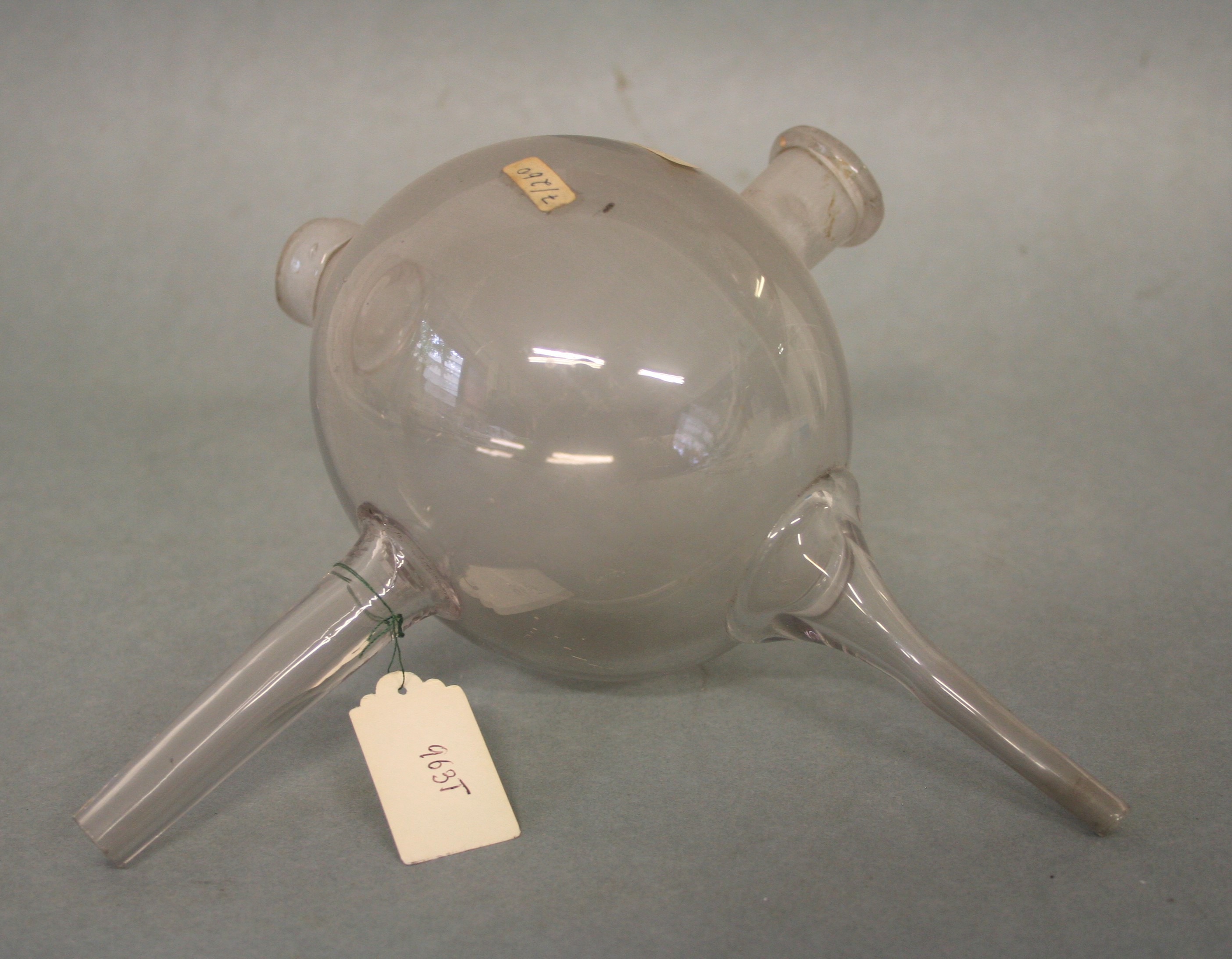 | Descrição: | Composto por um recipiente de vidro esférico duas tubuladuras e dois tubos, cap. 1.000 cm3. |