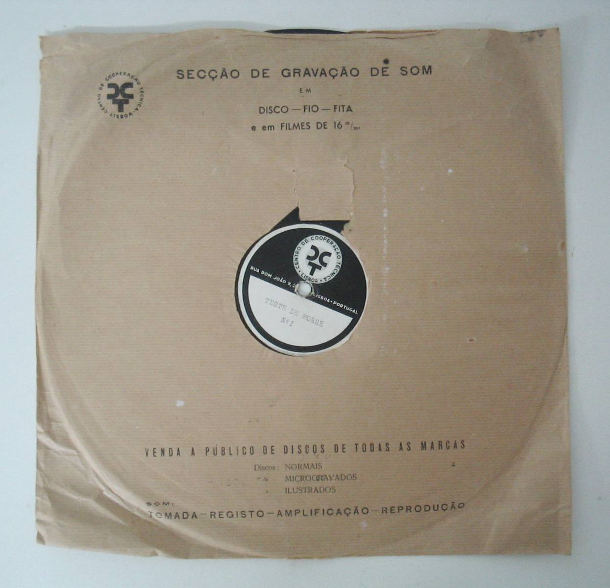 | Descrição: | Disco de vinil com gravação teste de Morse com capa em papel. Título: Teste de Morse nºI A capa em papel tem as seguintes inscrições: [logotipo do Centro de Cooperação Técnica, Lisboa] \ SECÇÃO DE GRAVAÇÃO DE SOM\EM\DISCO-FIO-FITA\e em FILME DE 16 m/m\VENDA A PÚBLICO DE DISCOS DE TODAS AS MARCAS\Discos:NORMAIS\Discos:MICROGRAVADOS\Discos:ILUSTRADOS\SOM:\TOMADA-REGISTO-AMPLIFICAÇÃO-REPRODUÇÃO |