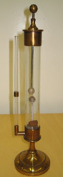 | Descrição: | Composto por um tubo de vidro grosso que nas suas extremidades possui duas guarnições de cobre que fecham hermeticamente o tubo. Estas contêm dois condutores que terminam num botão esférico. Um deles é fixo o outro desliza dentro da caixa de cobre. Lateralmente existe um segundo tubo aberto na sua parte superior. |