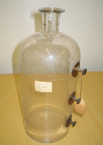 | Descrição: | Composto por uma vaso de vidro munido de três aberturas laterais, tapadas com tubos de latão e com um gargalo, que deve ser tapado por uma rolha e atravessada por um tubo de vidro aberto nas duas extremidades, de modo que a extremidade inferior fique um pouco acima do último orifício. |