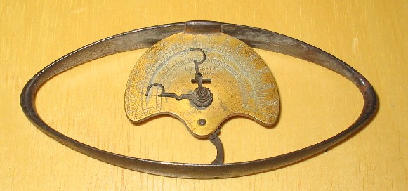 | Descrição: | Composto por um arco de metal cromado de forma elíptica. No centro do arco está presa uma chapa metálica com a forma de semicírculo, graduada de 0 a 110 kg. |