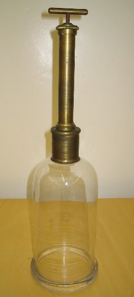 | Descrição: | Composta por uma campânula em vidro com cilindro de metal de pequeno diâmetro na parte superior. No interior do mesmo desloca-se um êmbolo uma haste também em latão, por onde se fazia a rarefação do ar. |