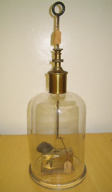 | Descrição: | Composta por uma campânula de vidro, onde no seu interior é colocada uma campainha, que é acionada por uma haste suspensa na parte interior da referida campânula. Estas são colocadas na platina de uma máquina pneumática e se observa como a intensidade das vibrações sonoras se reduzem ao diminuir a densidade de ar dentro da campânula. |