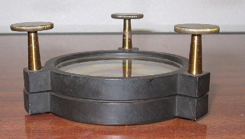 | Descrição: | Composto por dois anéis metálicos, por uma lentes plano-convexa, um vidro polido e por três parafusos de latão que os ajustam. |