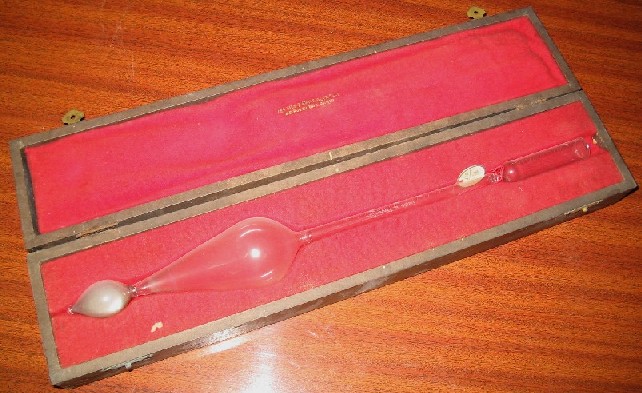 | Descrição: | Composto por um tubo ou haste de vidro com um reservatório cilindro na parte superior dividido em centímetros cúbicos e décimas de centímetro cúbico, tendo o zero desta graduação ao nível de 2 cm3. Na parte inferior tem uma ampola, e por baixo desta, outra mais pequena terminada em ponta, com mercúrio para o centro de gravidade ficar por baixo do centro de impulsão e conservar a haste vertical quando flutua. |