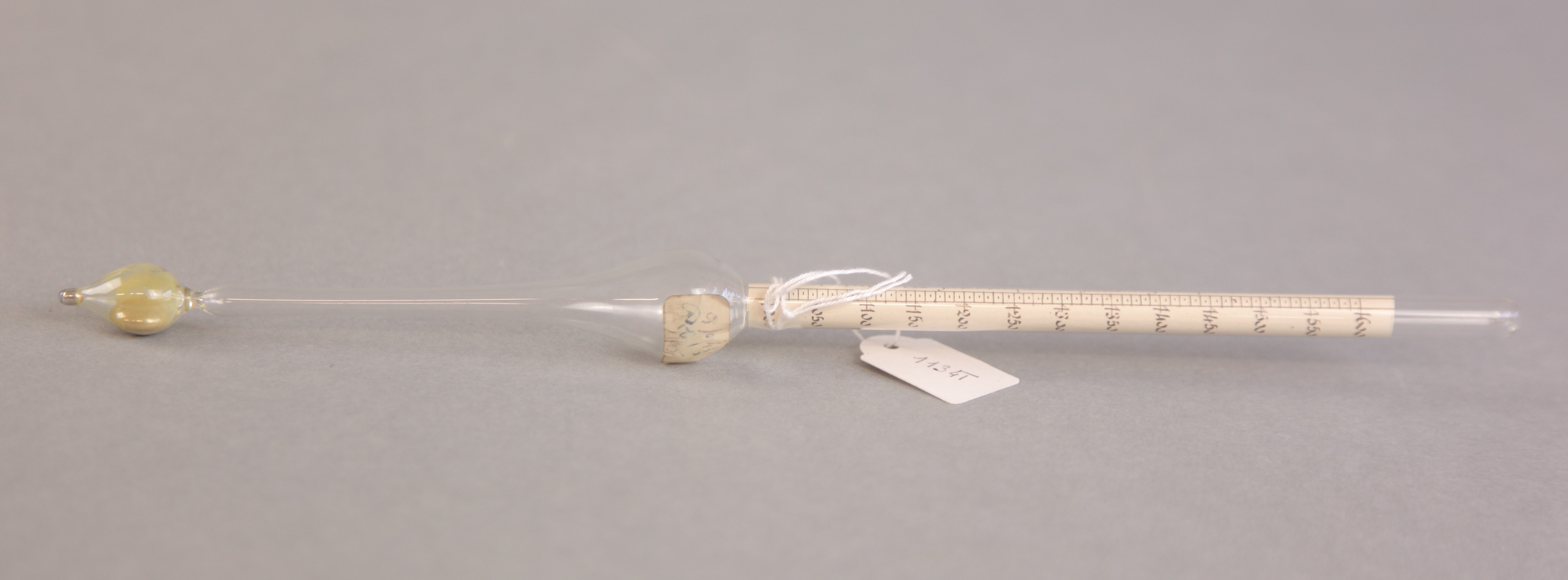 | Descrição: | Composto por uma haste de vidro perfeitamente cilíndrica, com uma escala no seu interior. Na parte inferior tem uma ampola estreita, e por baixo desta, outra mais pequena terminada em ponta, com mercúrio para o centro de gravidade por baixo do centro de impulsão e conservar a haste vertical quando flutua. |