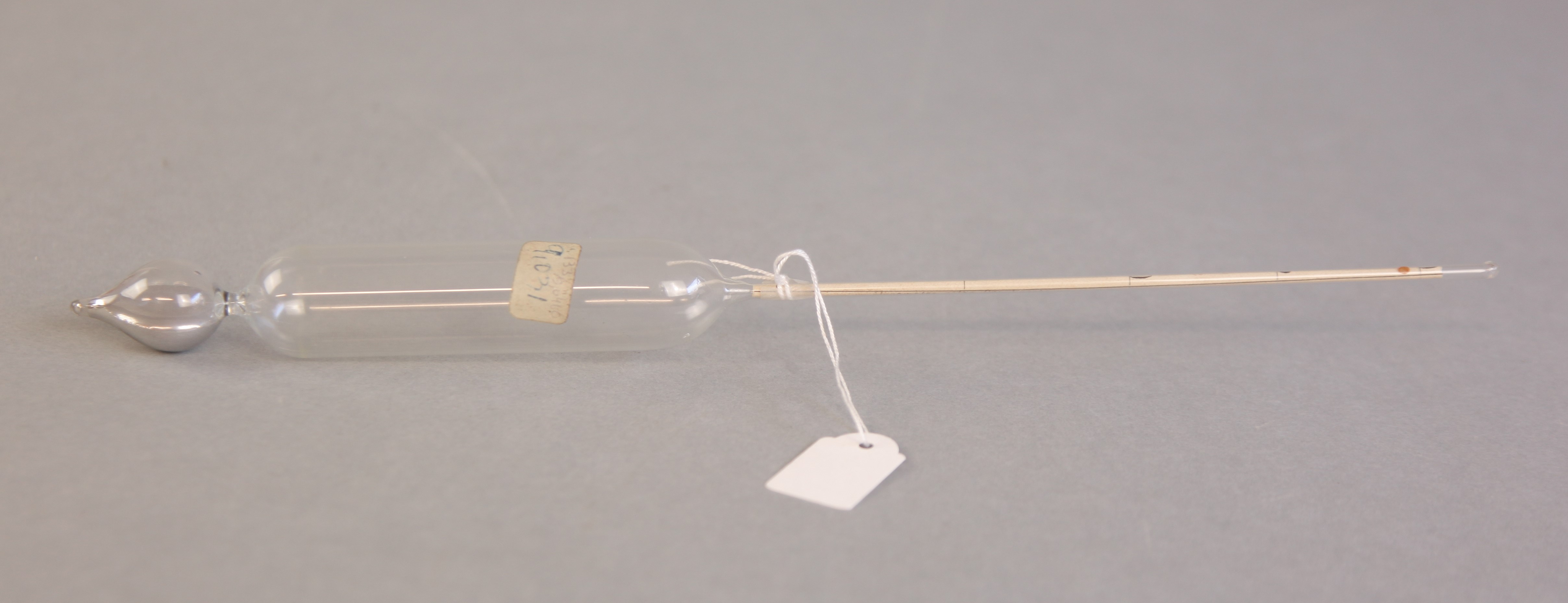 | Descrição: | Composto por uma haste de vidro perfeitamente cilíndrica, com uma escala no seu interior. Na parte inferior tem uma ampola, e por baixo desta, outra mais pequena terminada em ponta, com mercúrio para o centro de gravidade por baixo do centro de impulsão e conservar a haste vertical quando flutua. |